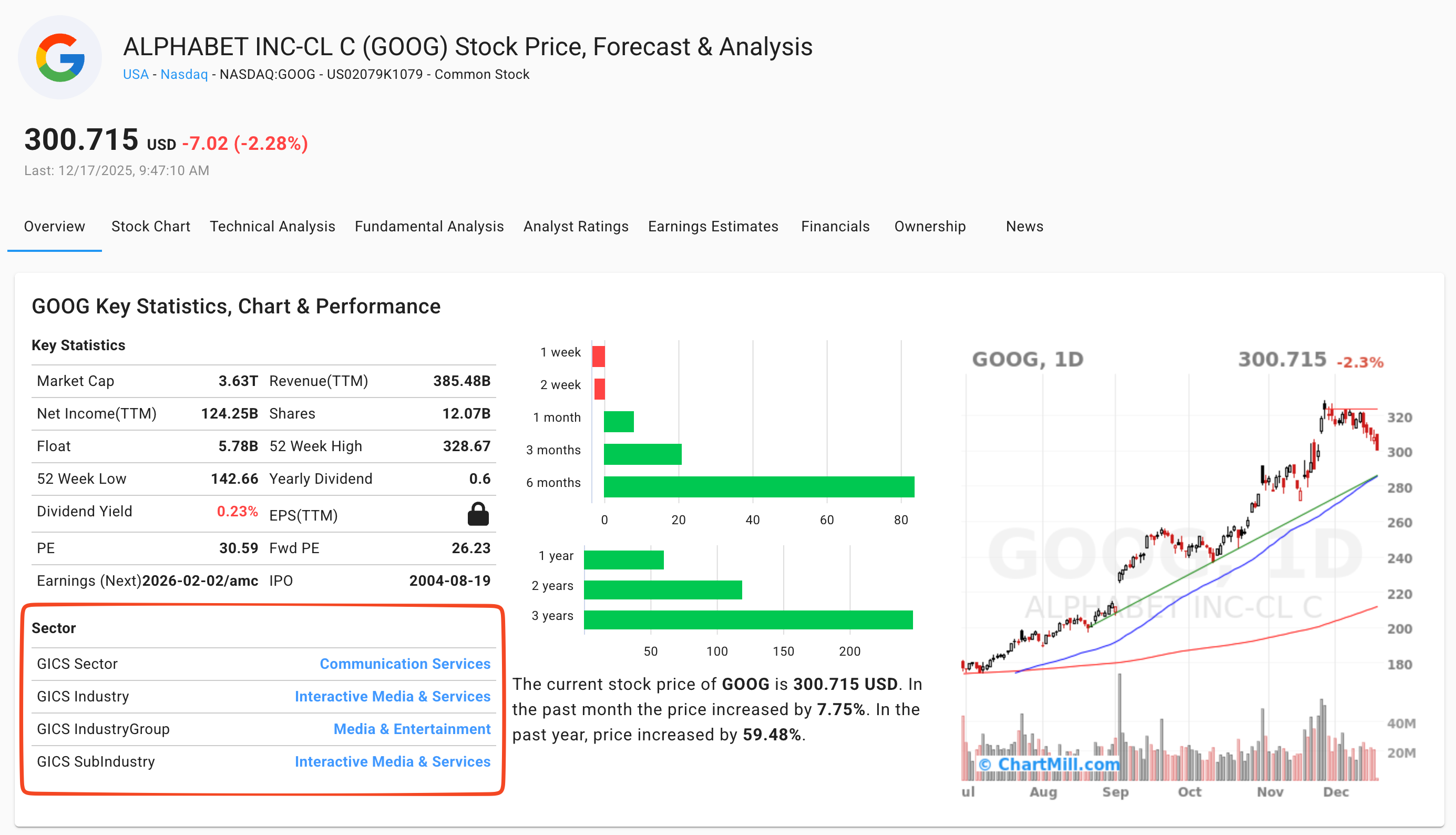 El sistema GICS tambien tiene codificacion, por ejemplo este seria el codigo del sector al que pertenece Alphabet: 50203010
