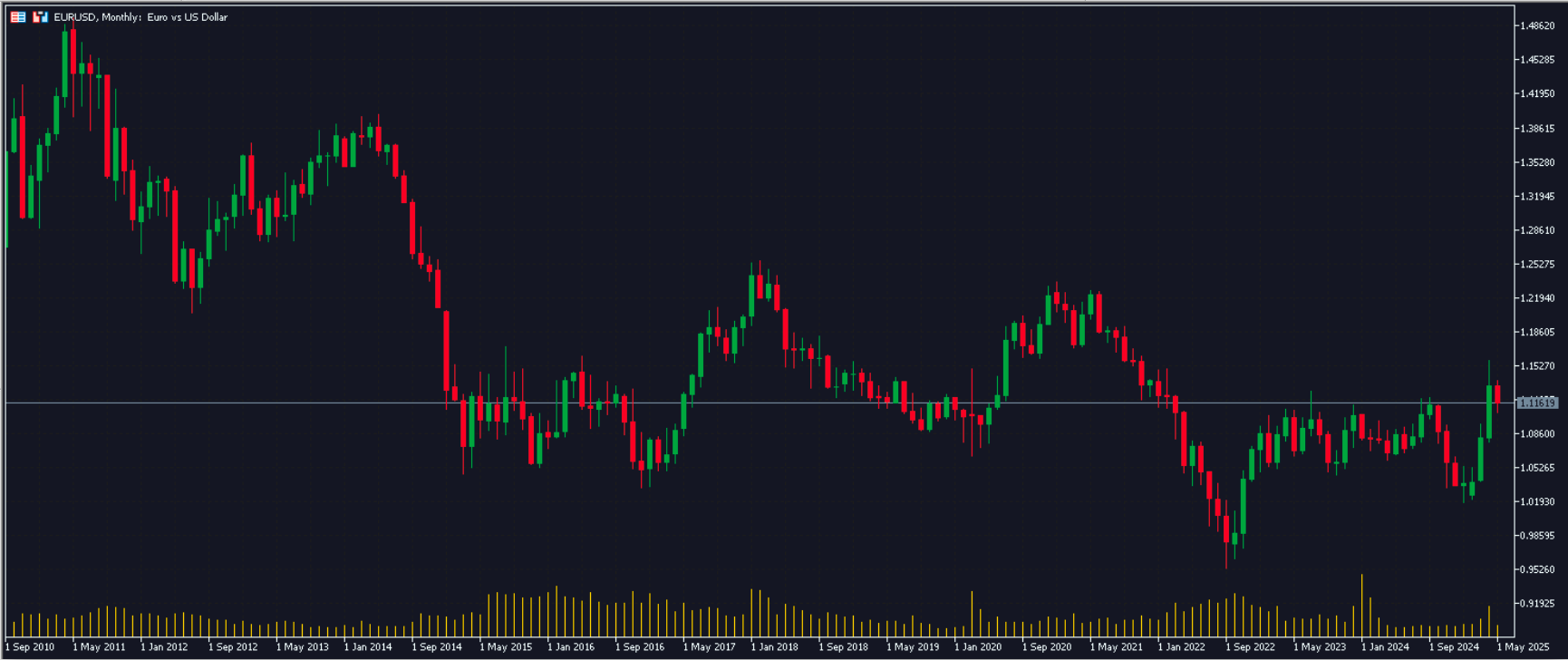 Ejemplo de gráfico EUR/USD en gráfico mensual. Plataforma MT5 (MetaTrader 5)